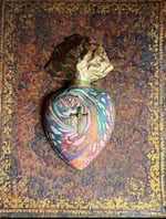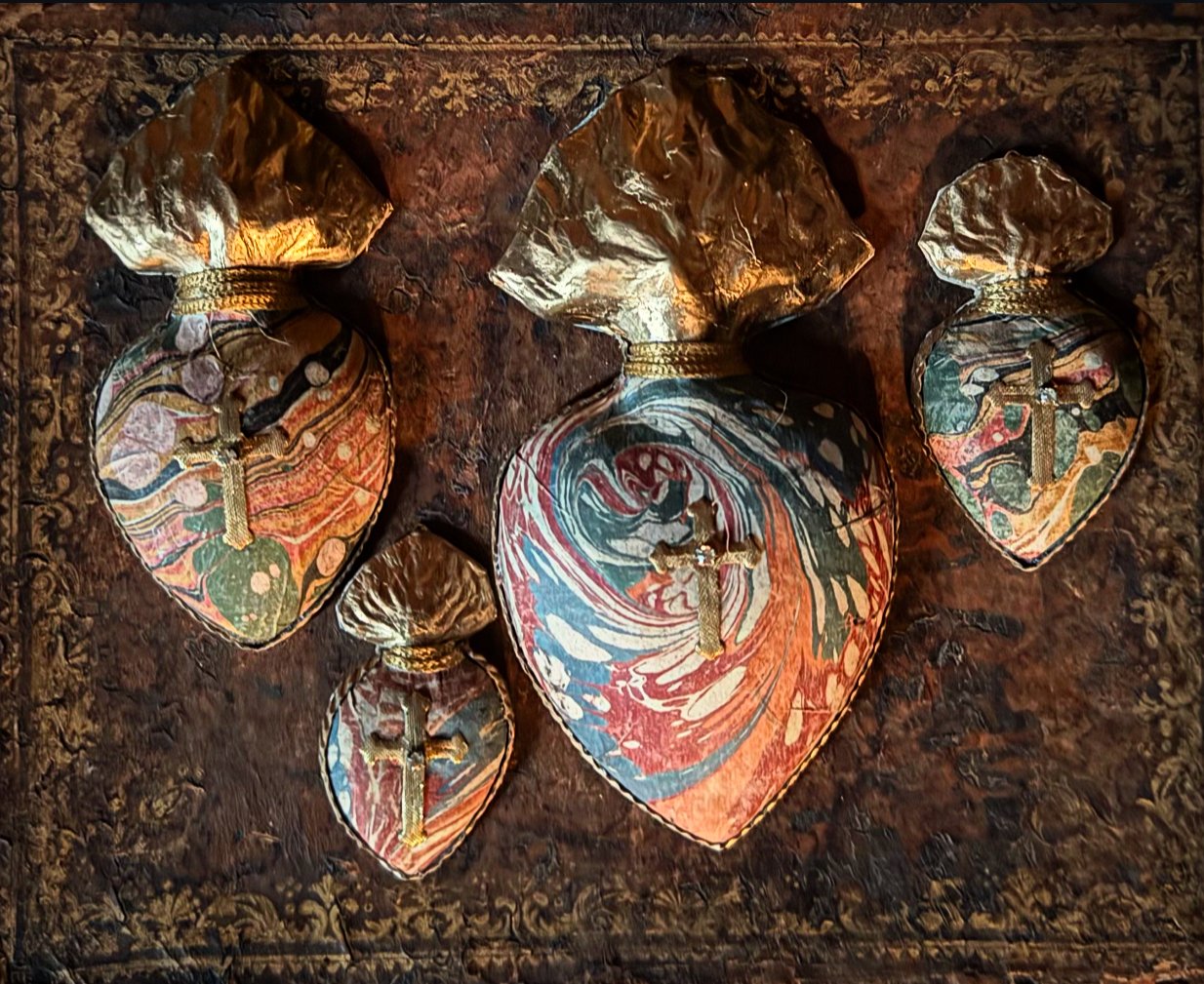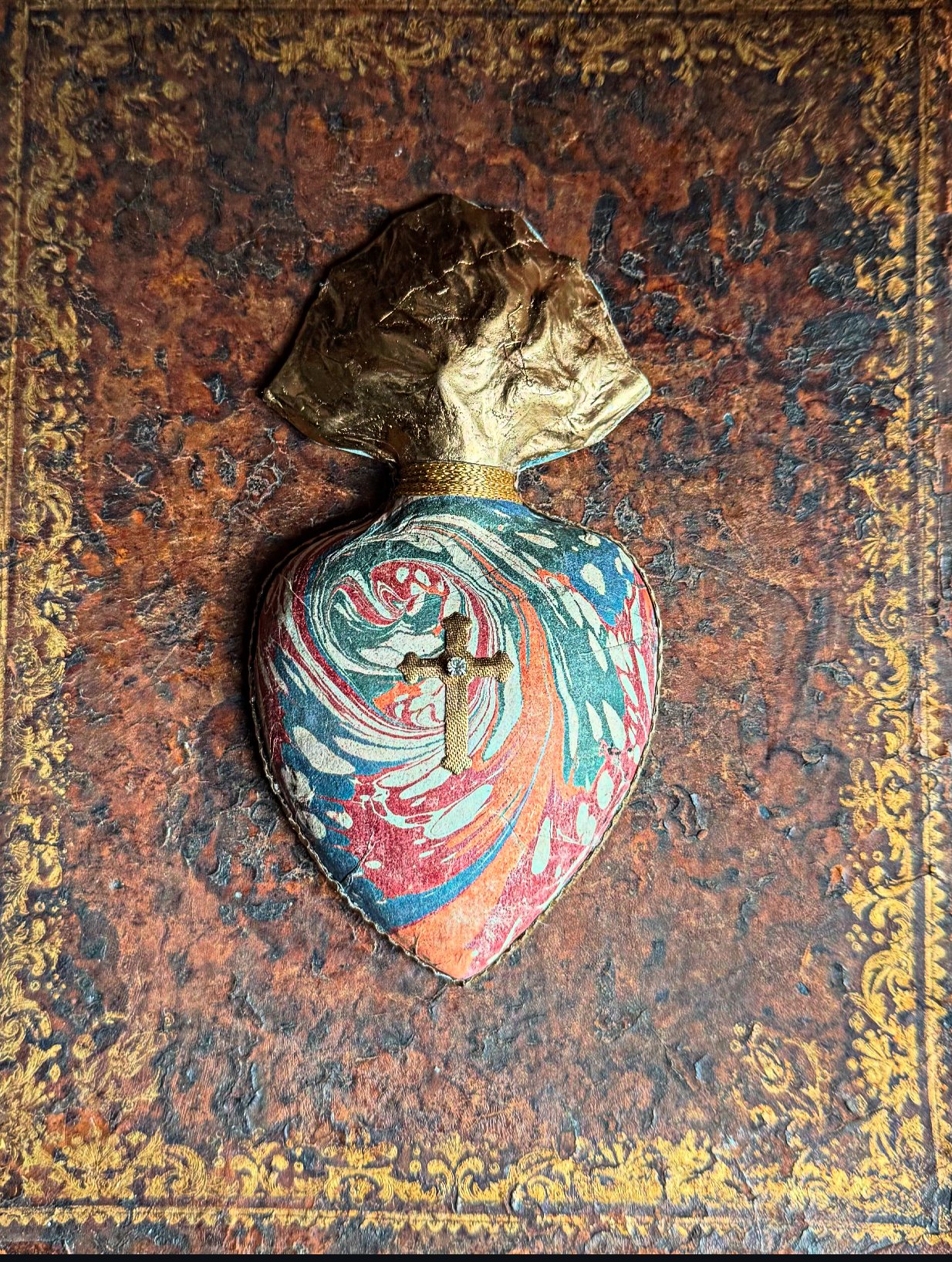 Ex voto papier mâché et papier marbré XVIII ème, Ruban or strass ancien et croix tissu or