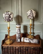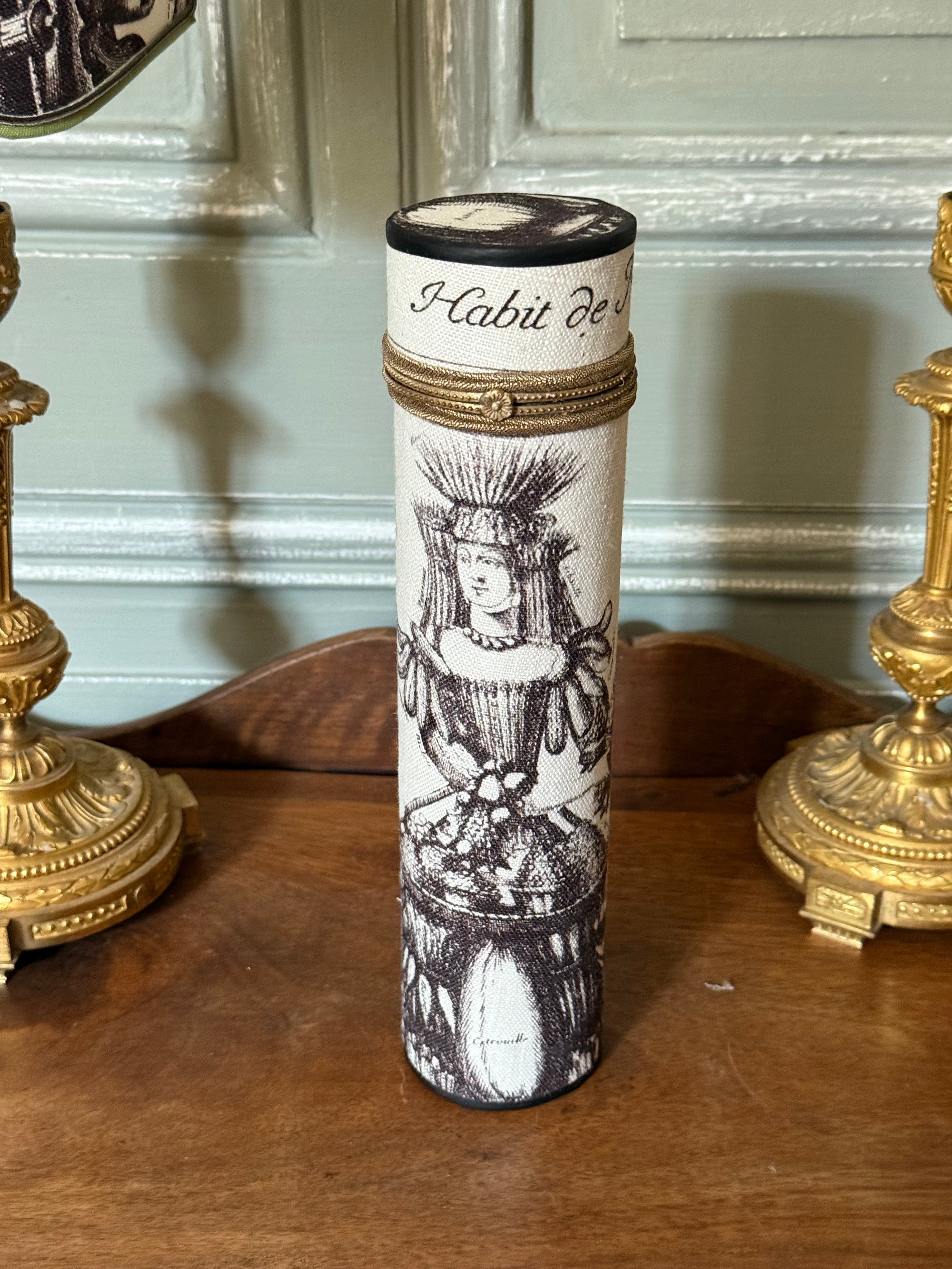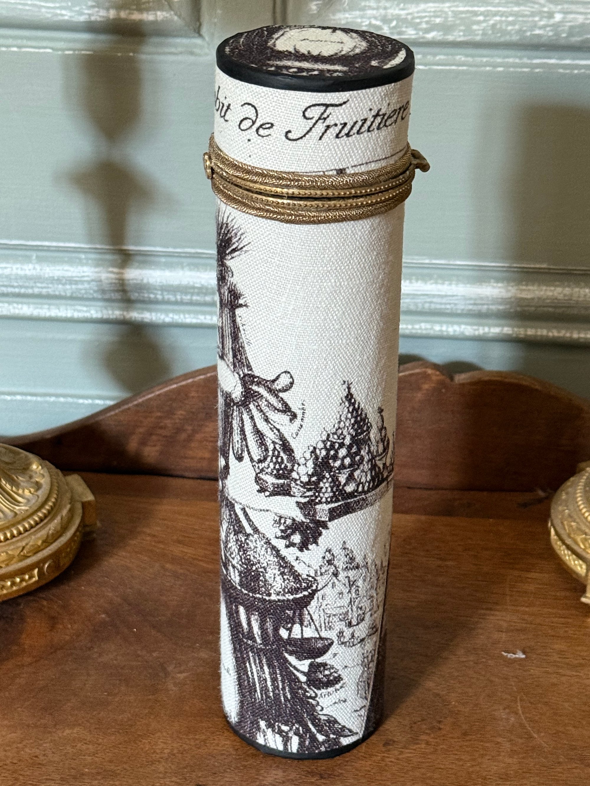 Grand étui rigide fermeture métal doré fait dans un tissu Pierre Frey « l’art des métiers » édition textile faite à partir des gravures de Nicolas de Larmessin