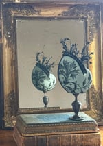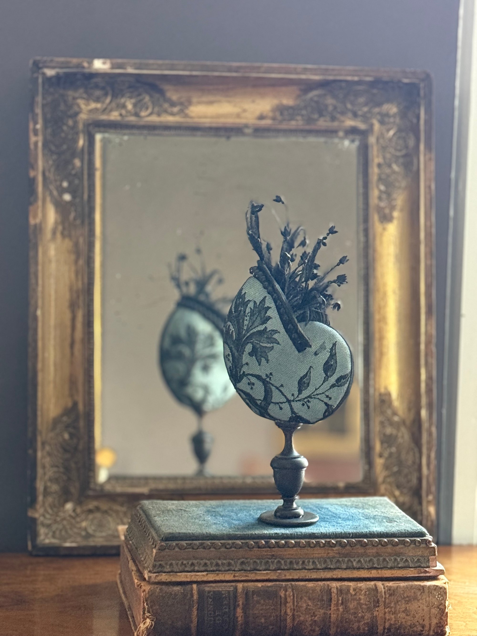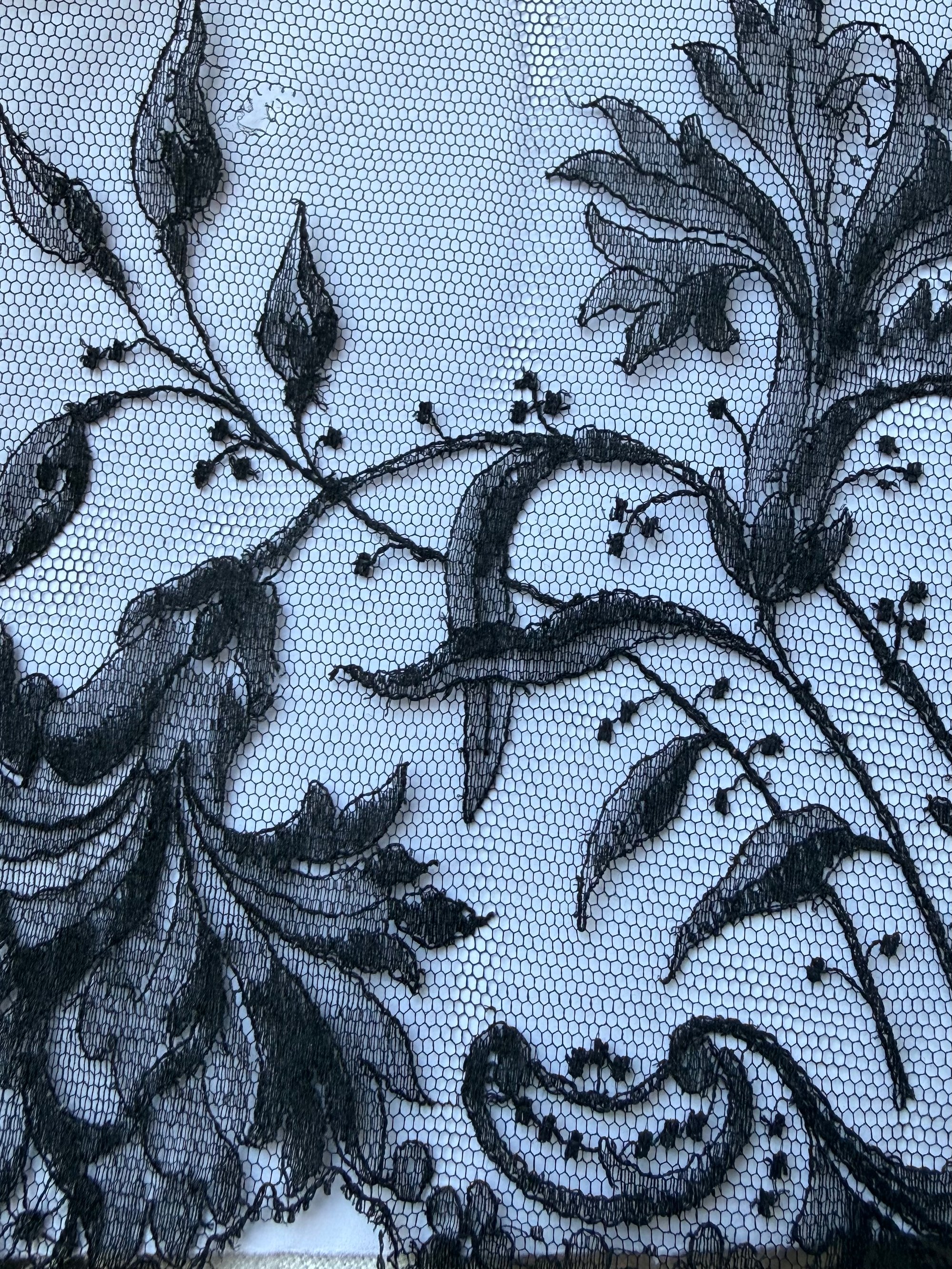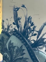 Nautile en papier mâché fait main bleu anglais habillé de dentelle chantilly ancienne noire, perle et plumes