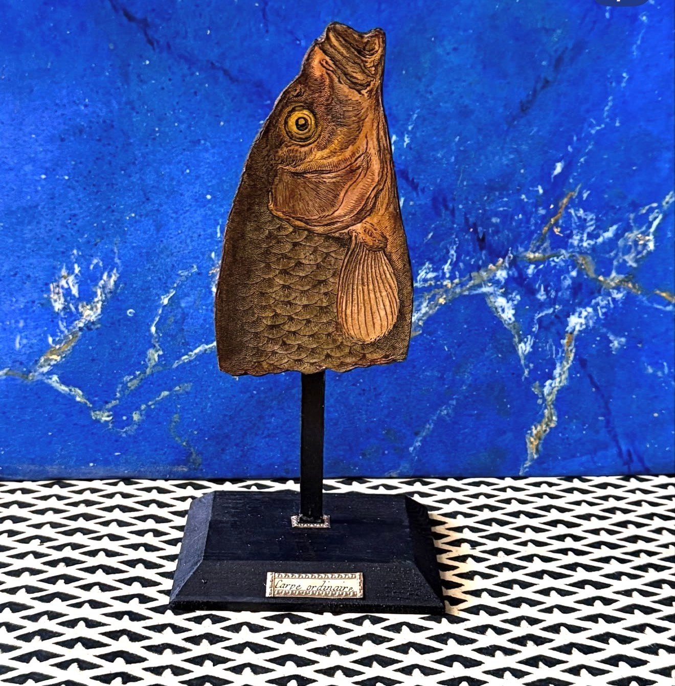 Silhouette de carpe ordinaire gravure histoire naturelle des poissons aquarellée et vernie montée sur socle bois noirci Hauteur 22cm x 11cm de large