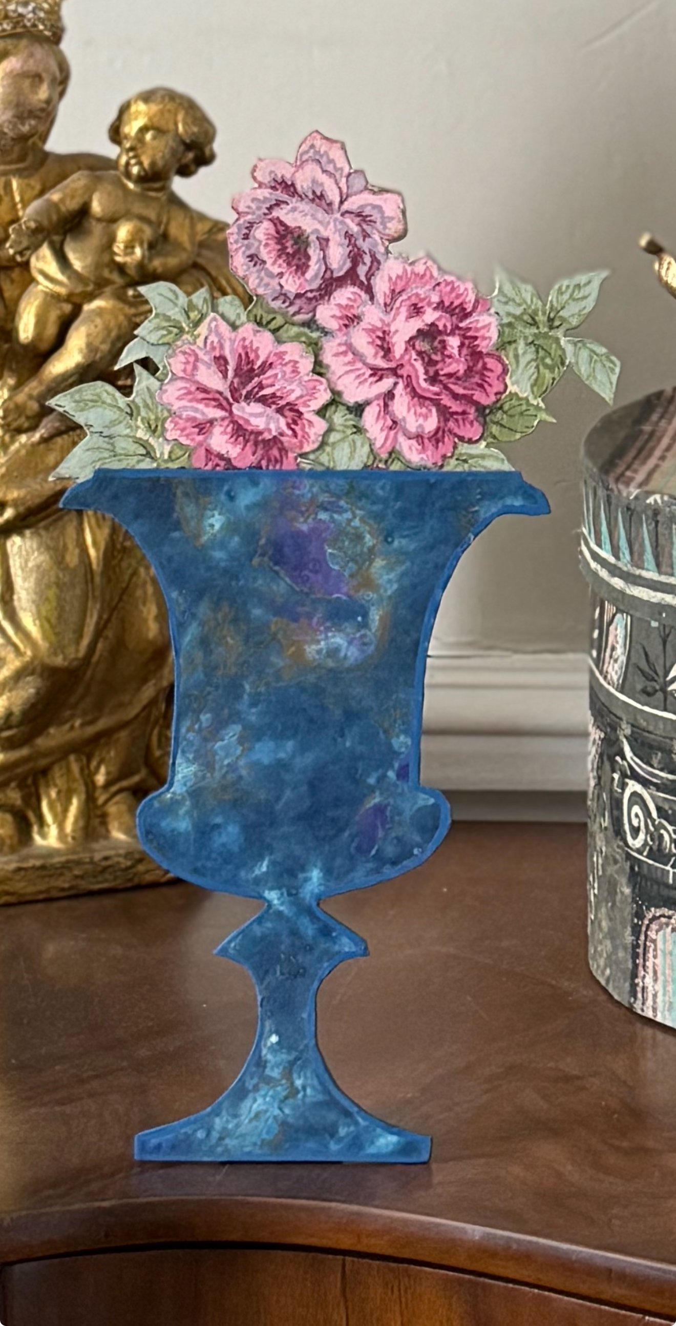 Silhouette vase Médicis carton bois habillé de papier façon lapis lazuli fait main et fleurs en papier peint ancien imprimé à la planche